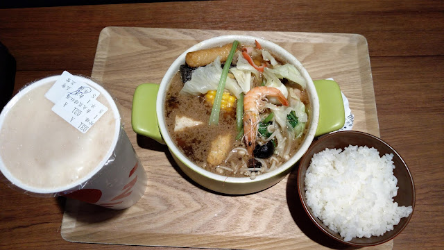 裡面的料有蔬菜、玉米、一隻蝦、米血、丸子、肉片、蟹肉棒、菇類、火鍋料的餃類